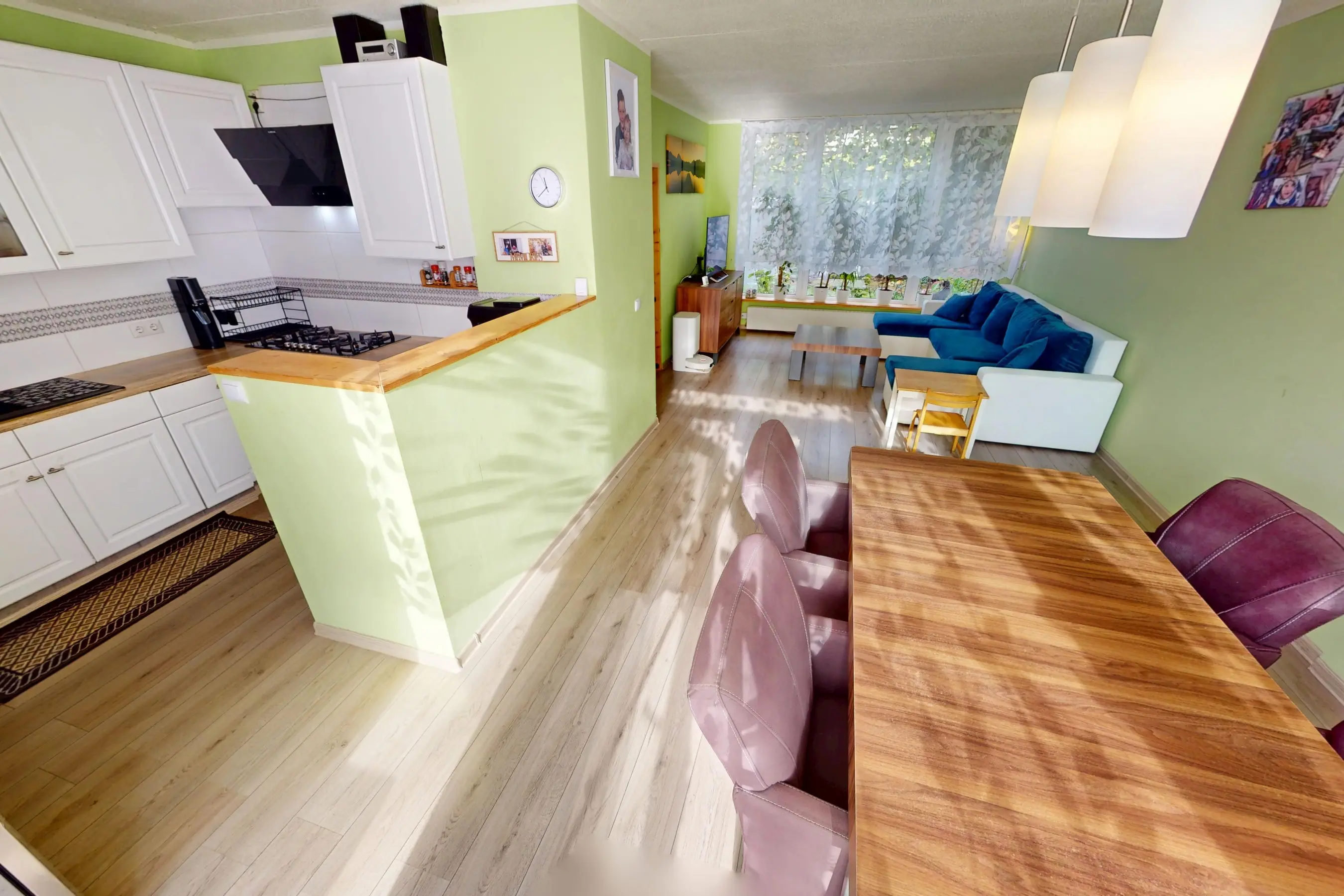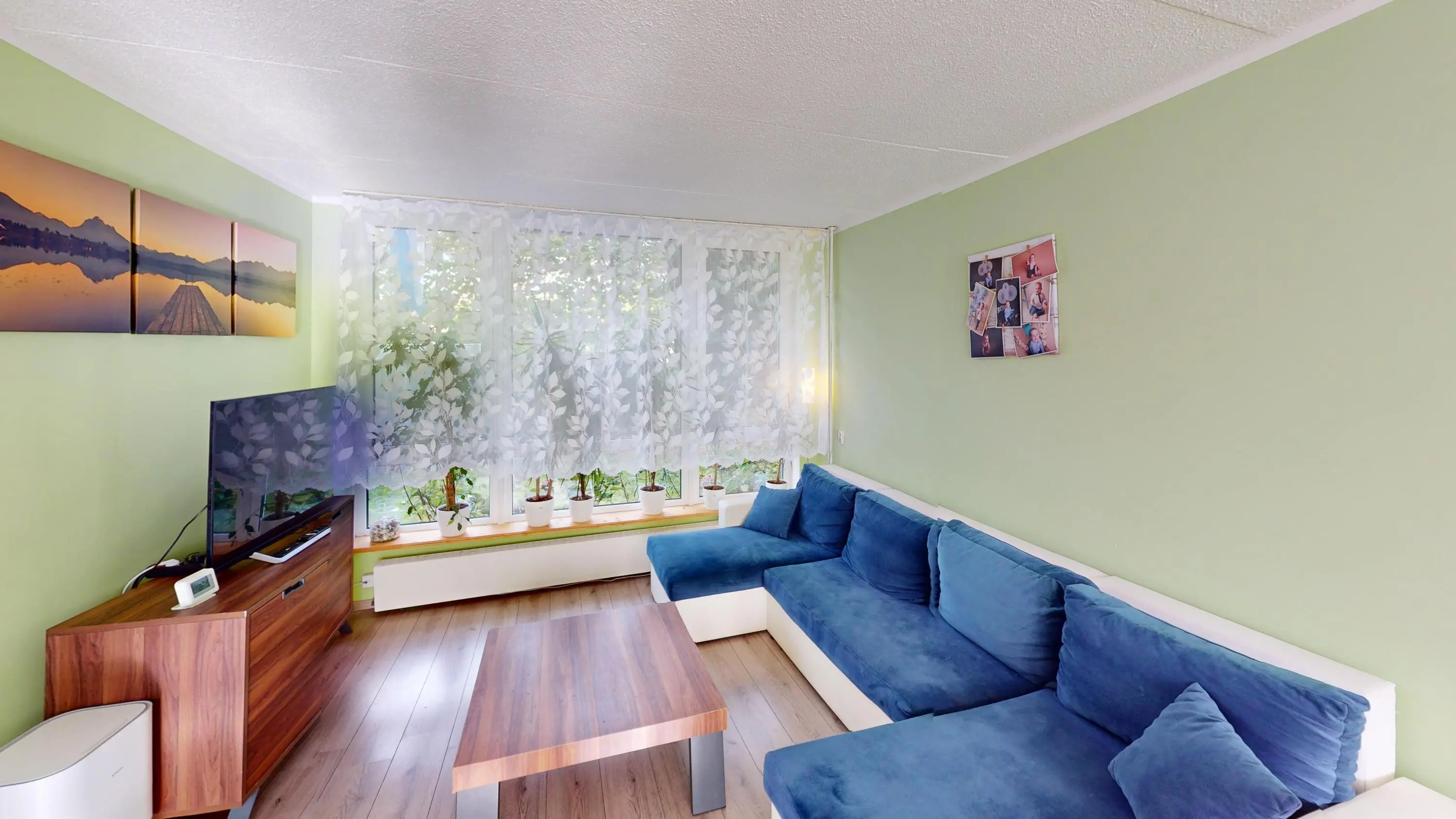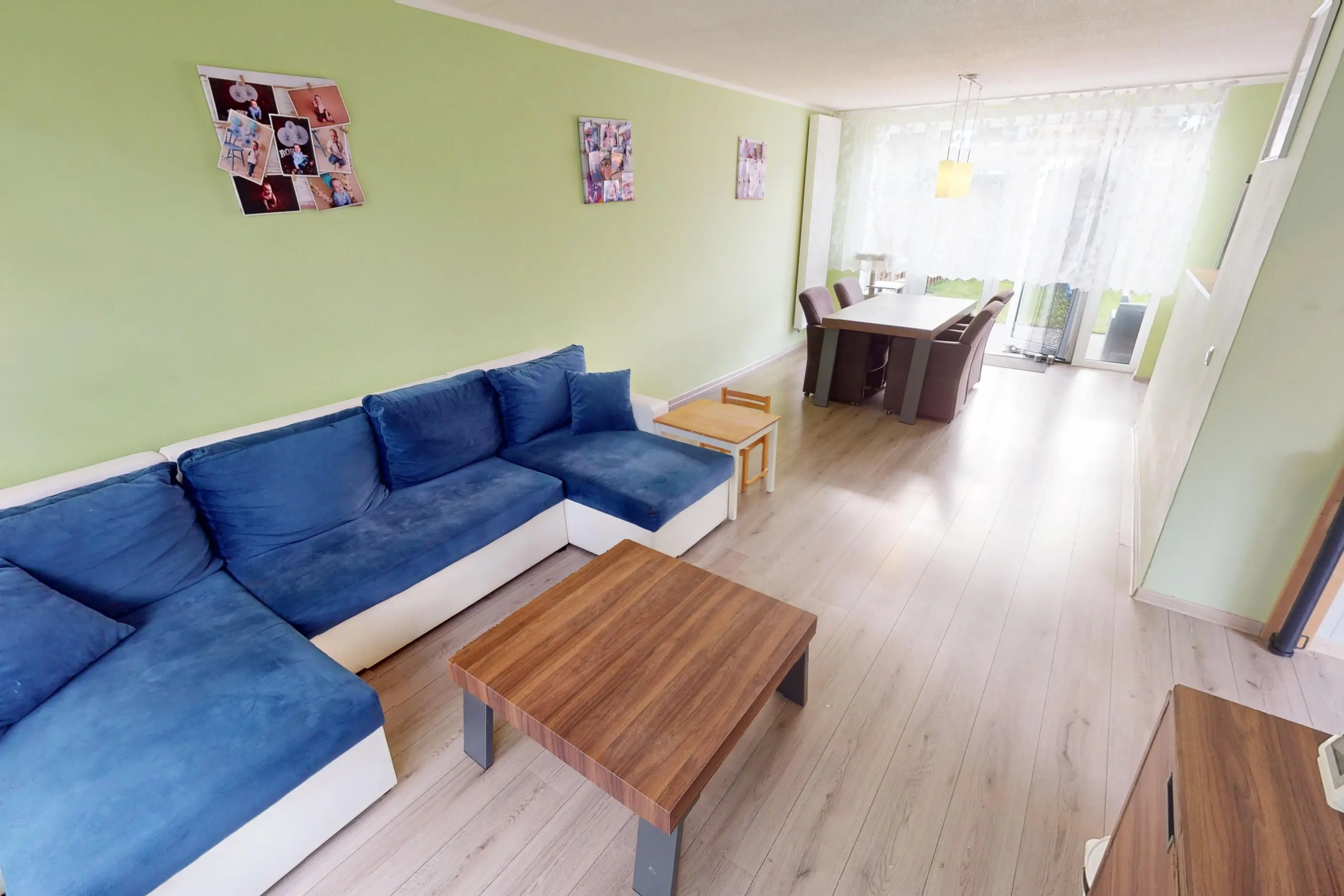 De woonkamer is keurig afgewerkt en voorzien van een laminaatvloer. Vanaf het zitgedeelte heeft u fijn zicht op de voortuin. Door de praktische vormgeving kunt u op diverse wijzen uw interieur indelen. Aan de achterzijde heeft u voldoende ruimte om een grote eettafel te plaatsen. Via de openslaande kunststof tuindeuren kunt u de zonnige achtertuin op het zuiden bereiken.