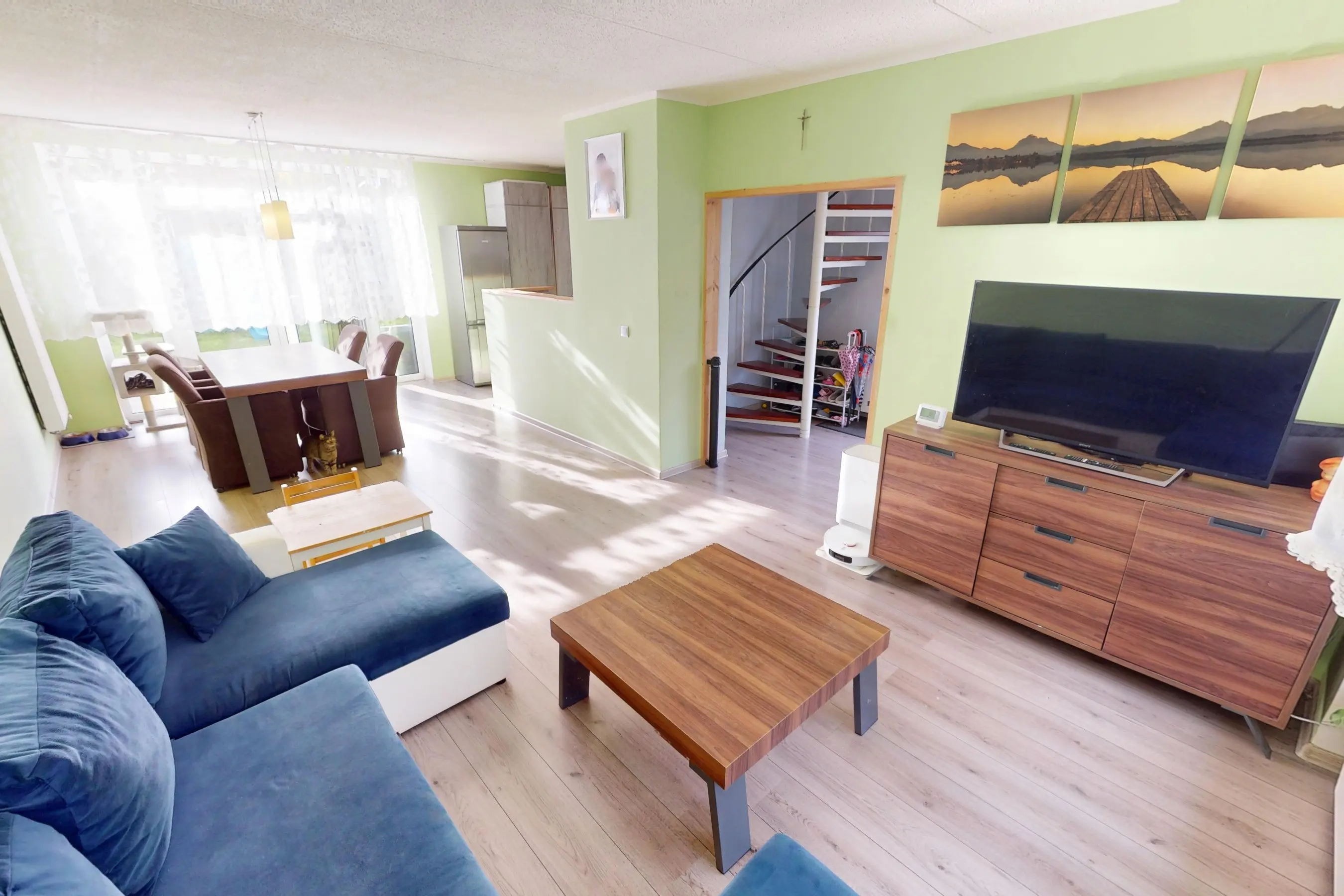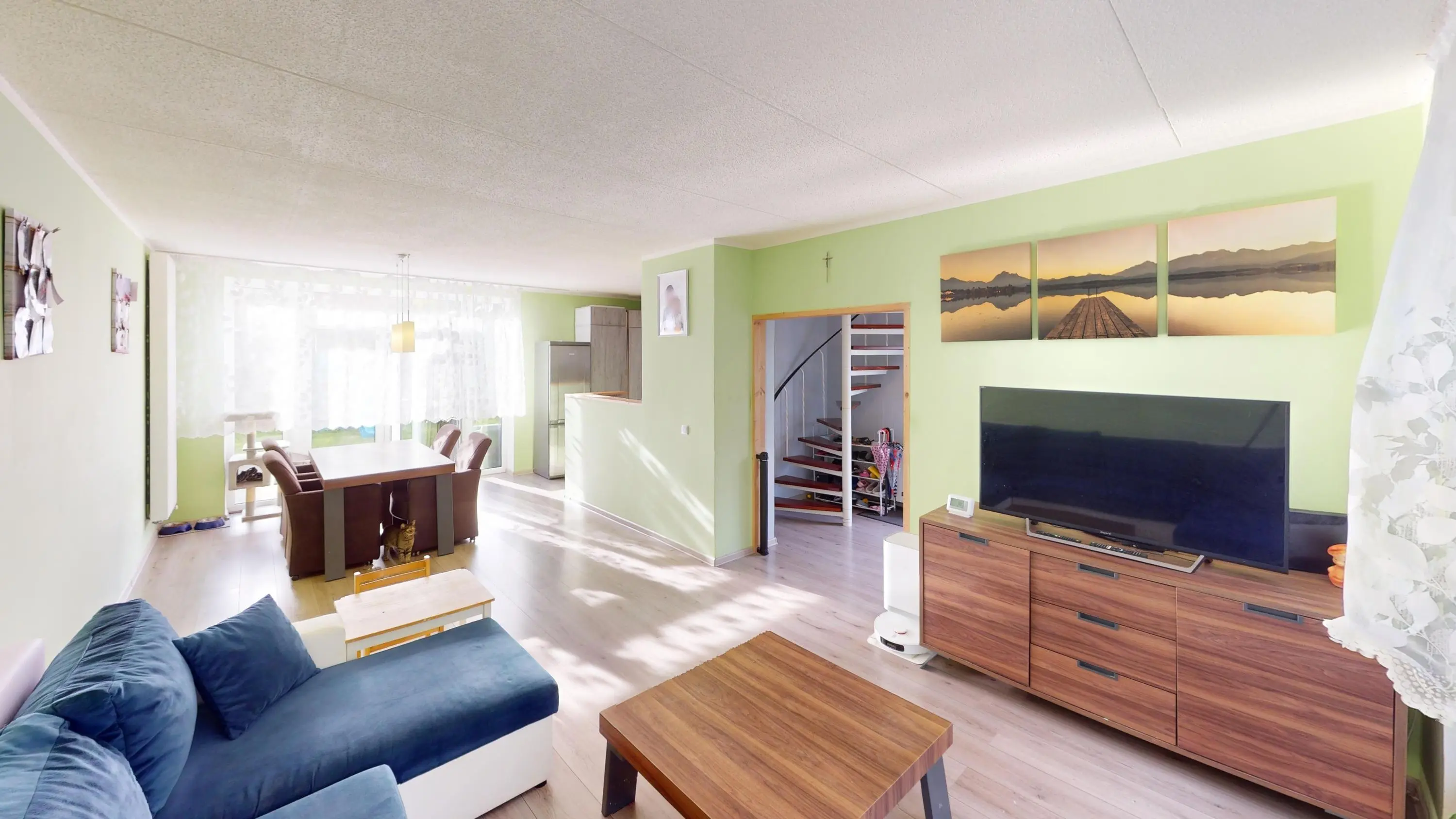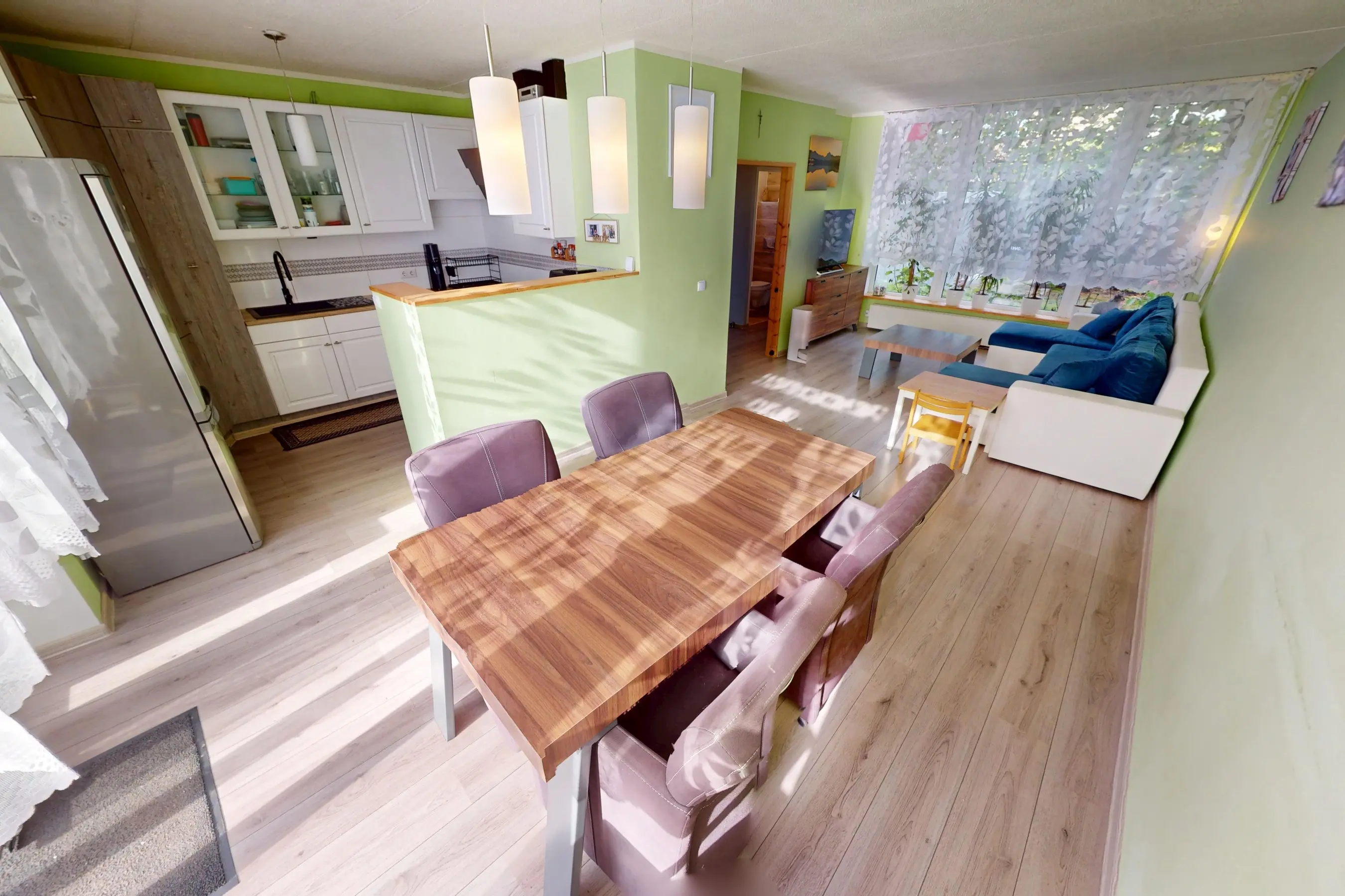 De woonkamer is keurig afgewerkt en voorzien van een laminaatvloer. Vanaf het zitgedeelte heeft u fijn zicht op de voortuin. Door de praktische vormgeving kunt u op diverse wijzen uw interieur indelen. Aan de achterzijde heeft u voldoende ruimte om een grote eettafel te plaatsen. Via de openslaande kunststof tuindeuren kunt u de zonnige achtertuin op het zuiden bereiken.