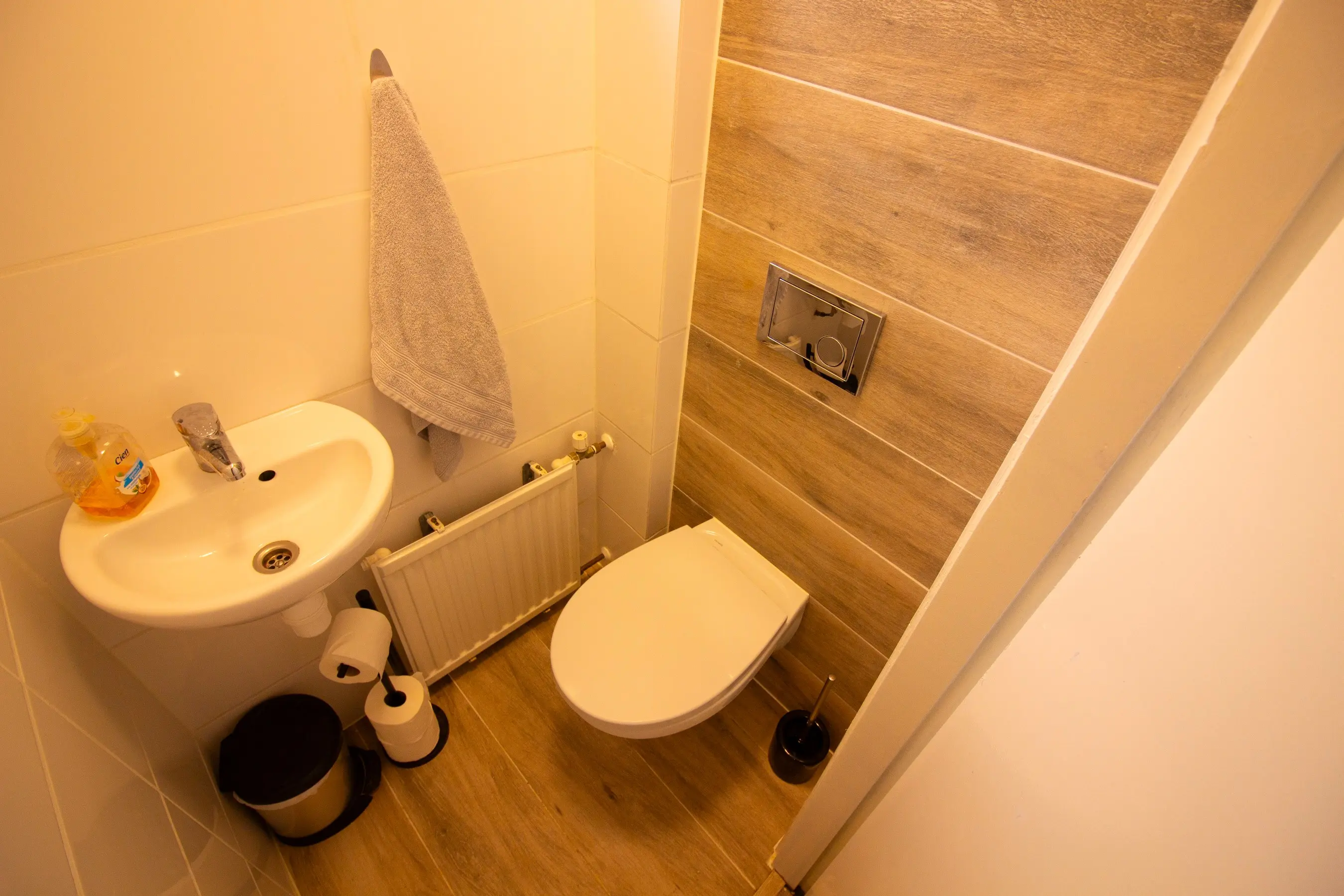 De functionele badkamer is voorzien van een douchegelegenheid, wastafel met zuil, toilet en ligbad. Tevens is hier een designradiator geïnstalleerd.