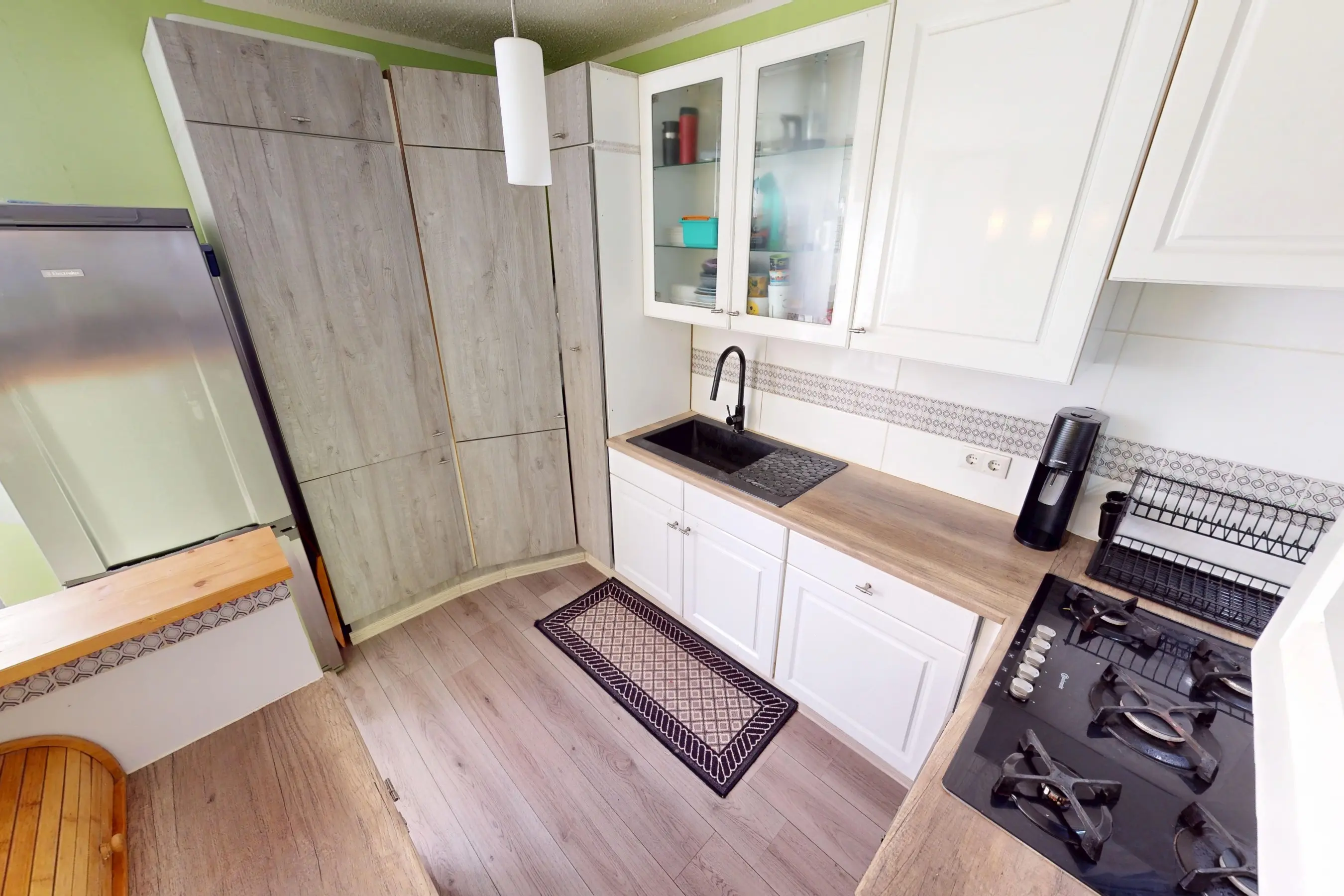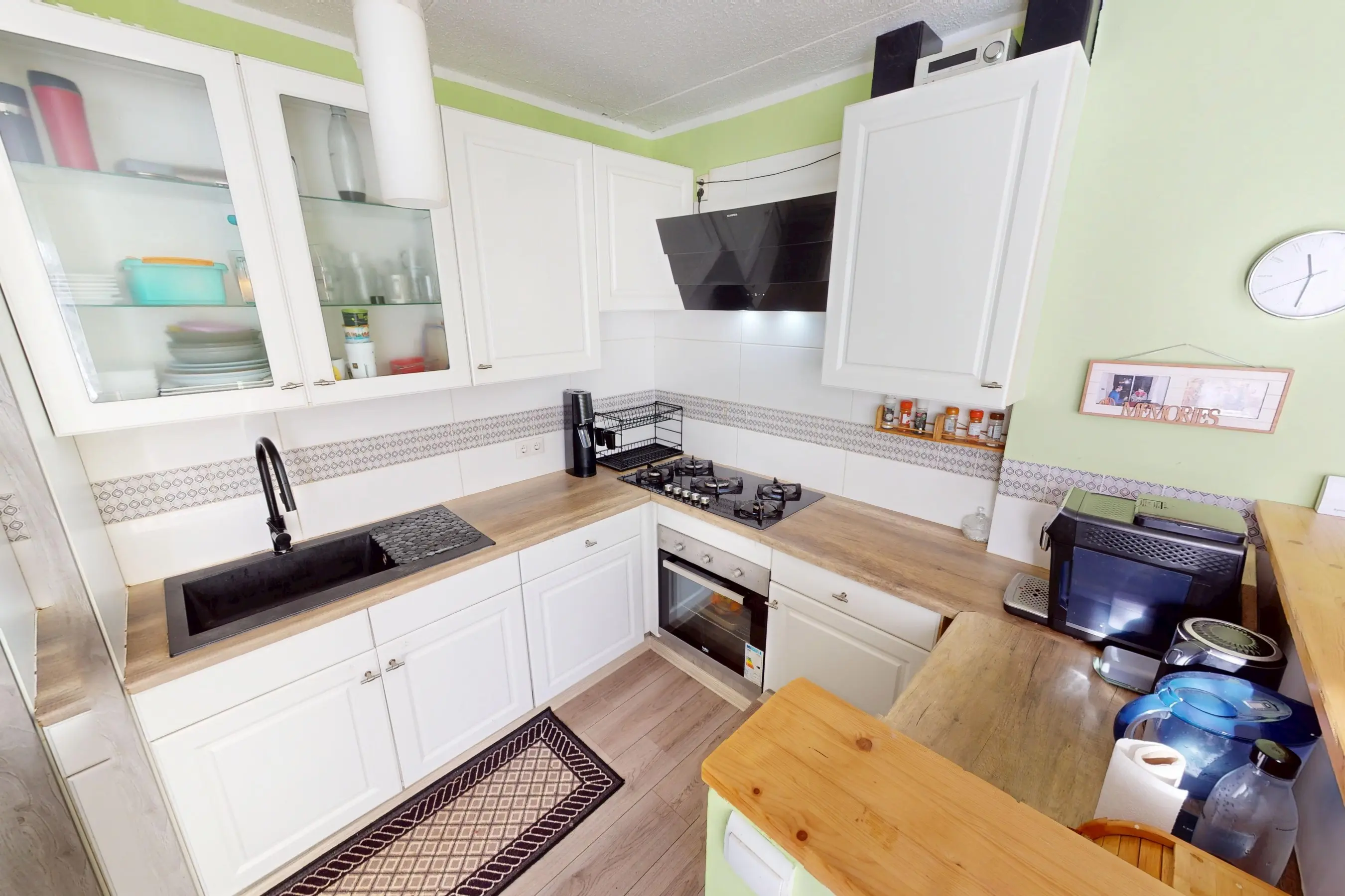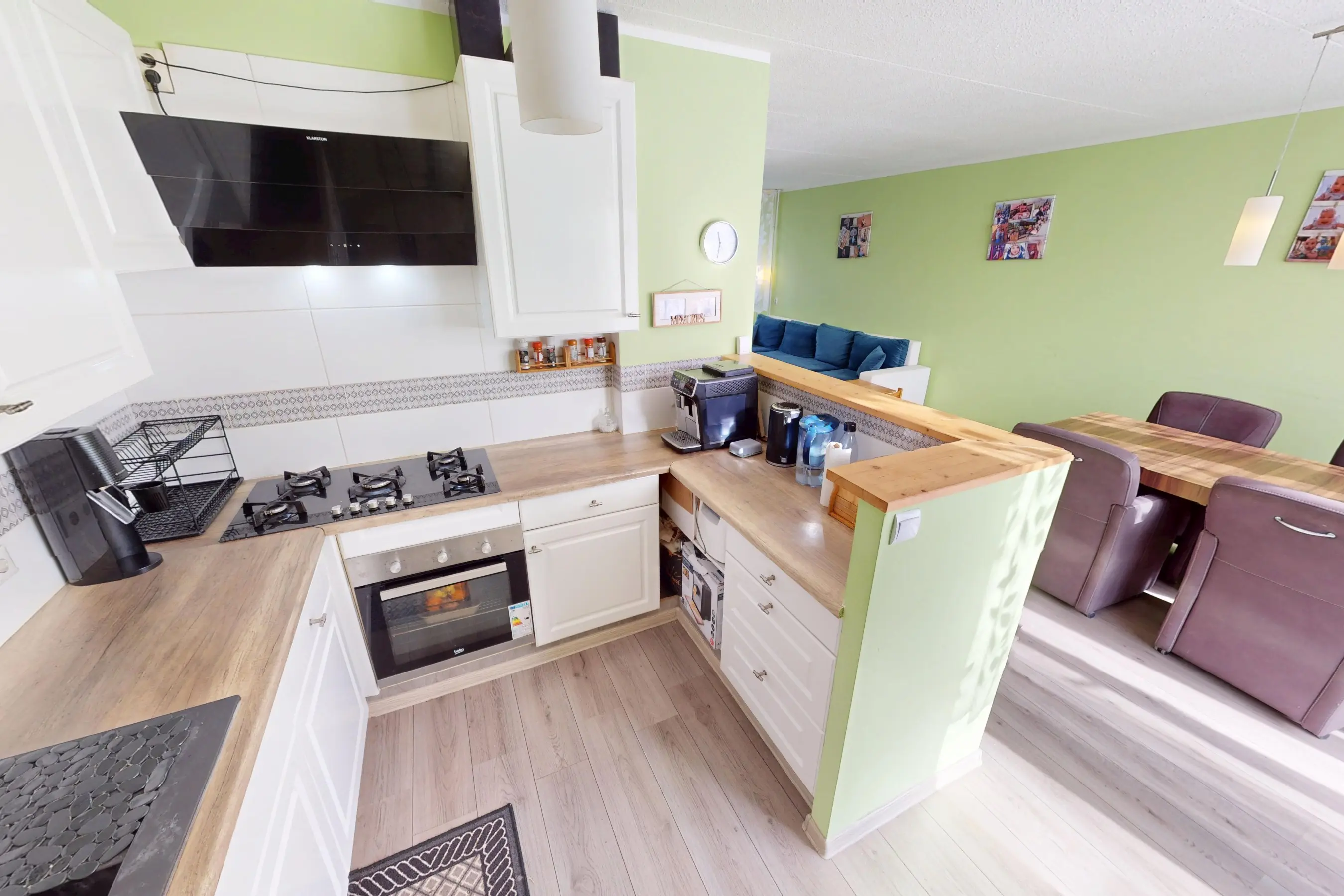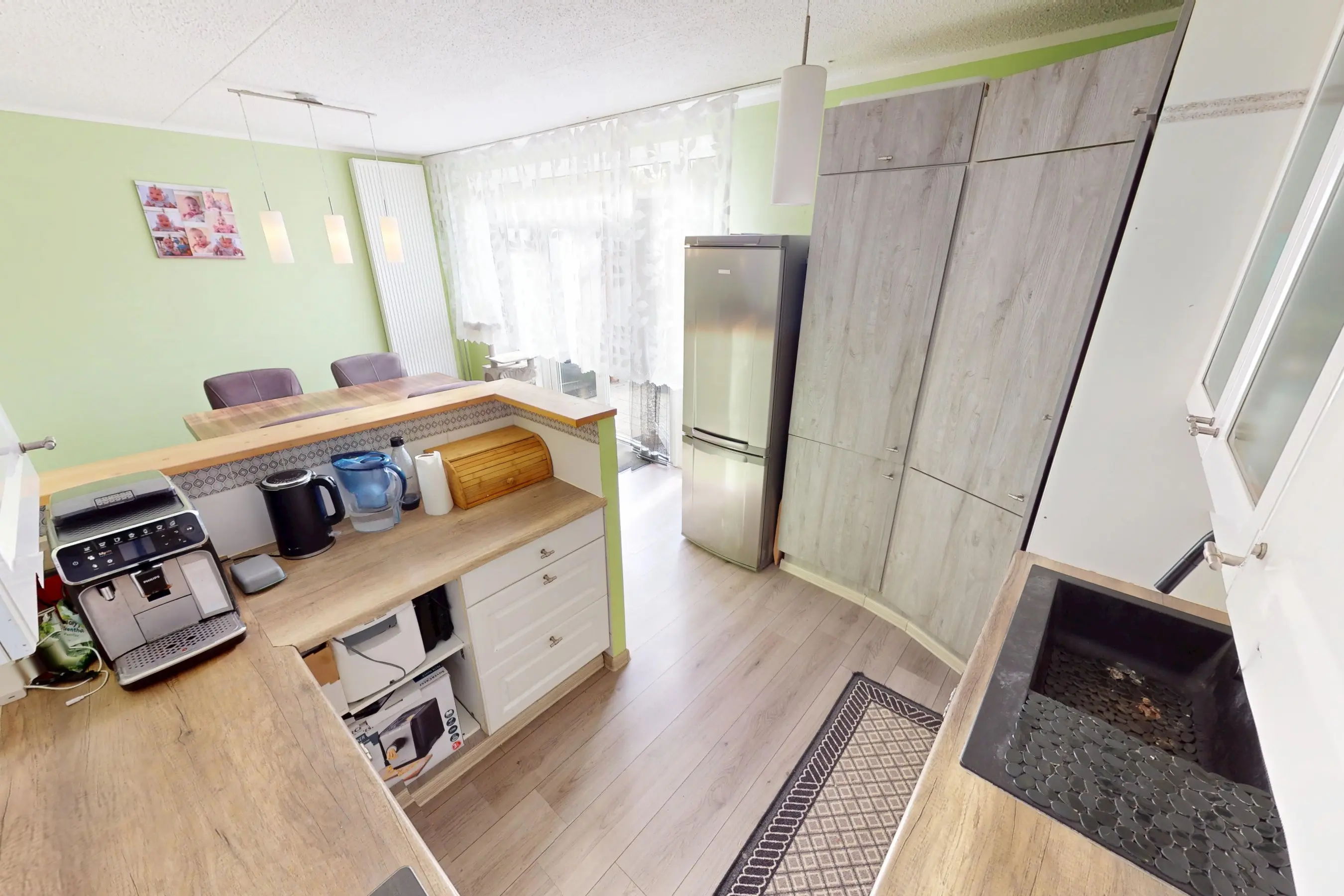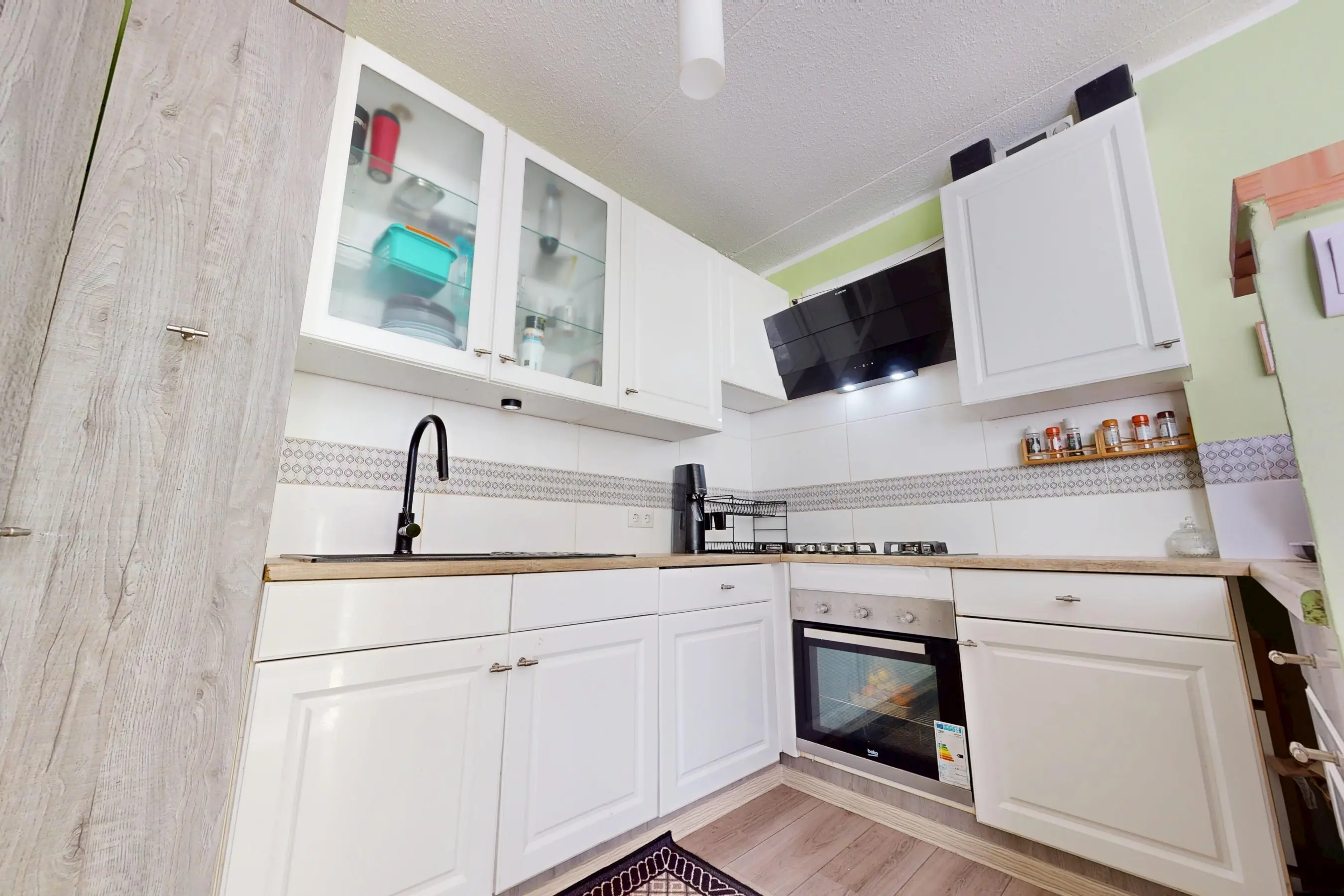 De keurige functionele keuken is in een lichte kleurstelling uitgevoerd. Aan apparatuur zijn een afzuigkap, 5 pits gaskookplaat, hete luchtoven, vaatwasser en een losse koel/vriescombinatie aanwezig. U heeft veel werkruimte en kastruimte tot uw beschikking. De keuken is fijn verbonden met de woonkamer. Vanuit de keuken heeft u goed contact met uw familieleden.