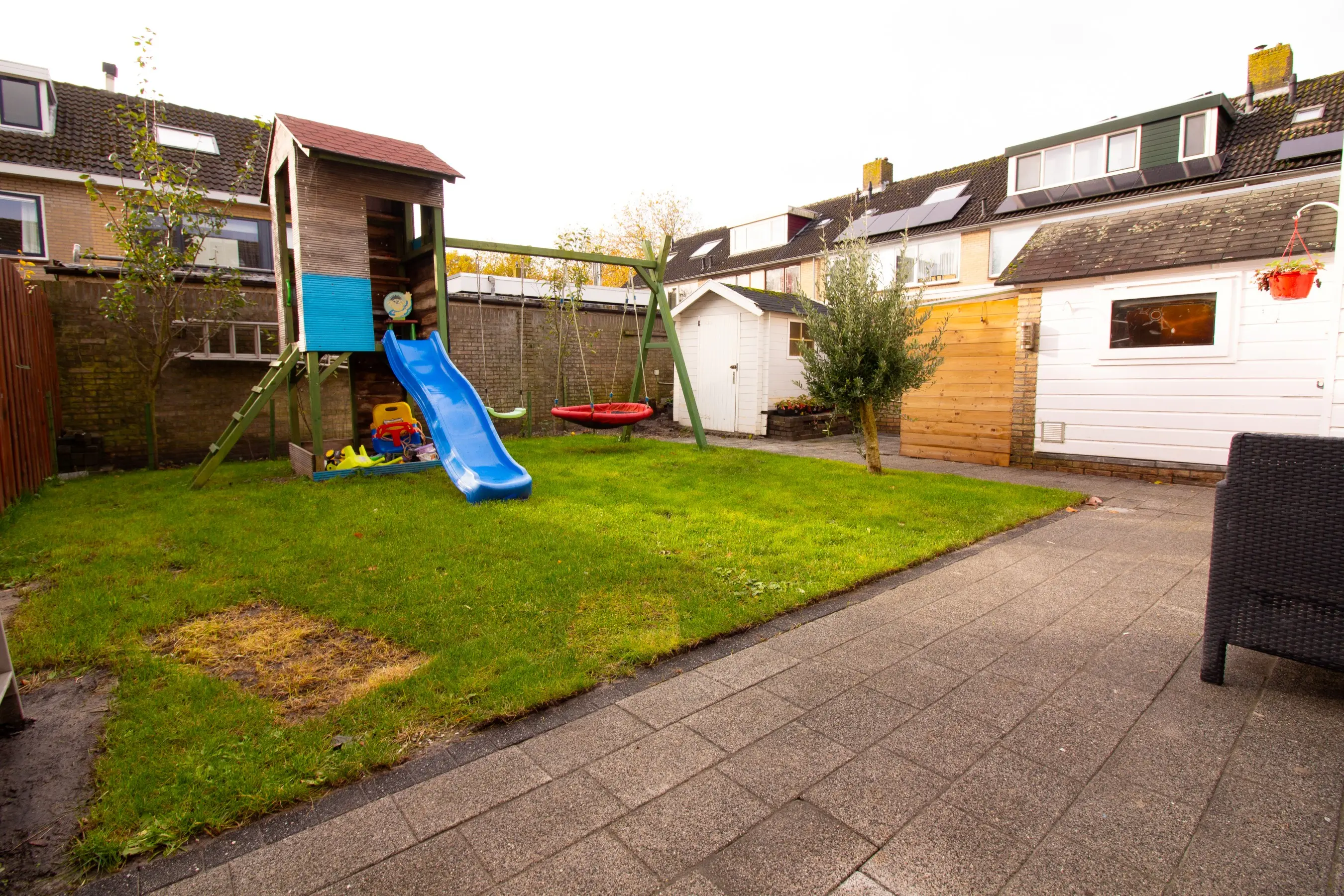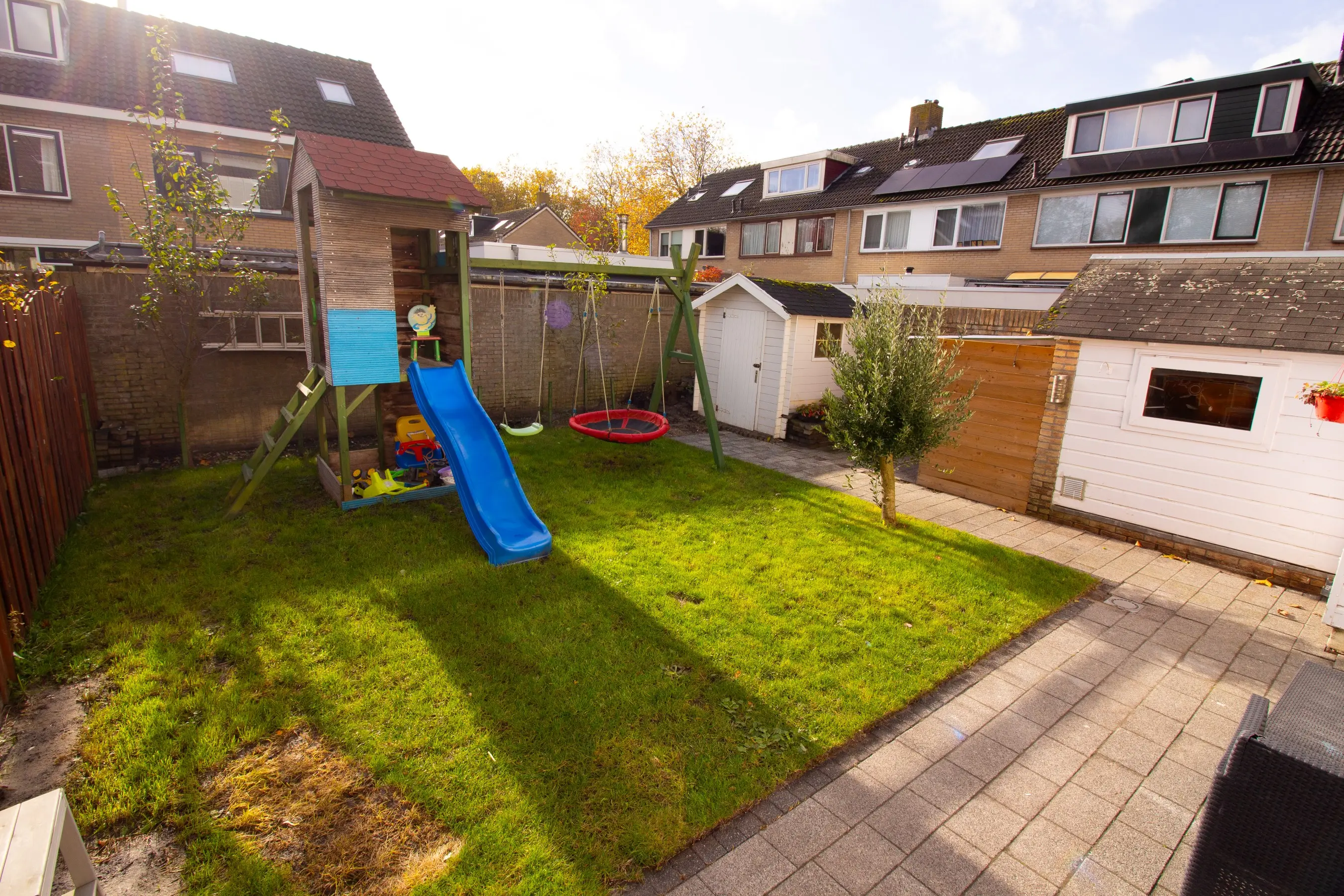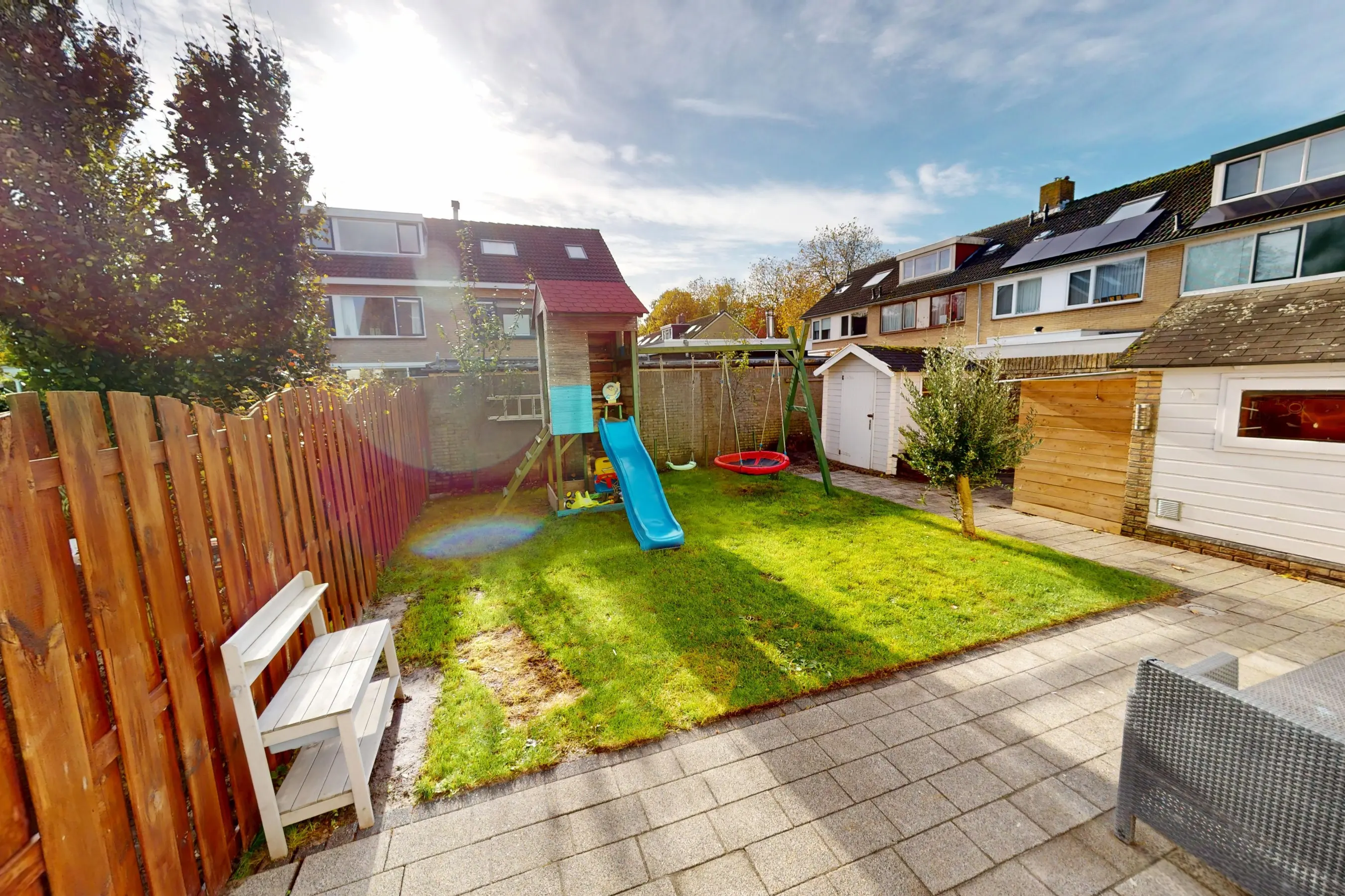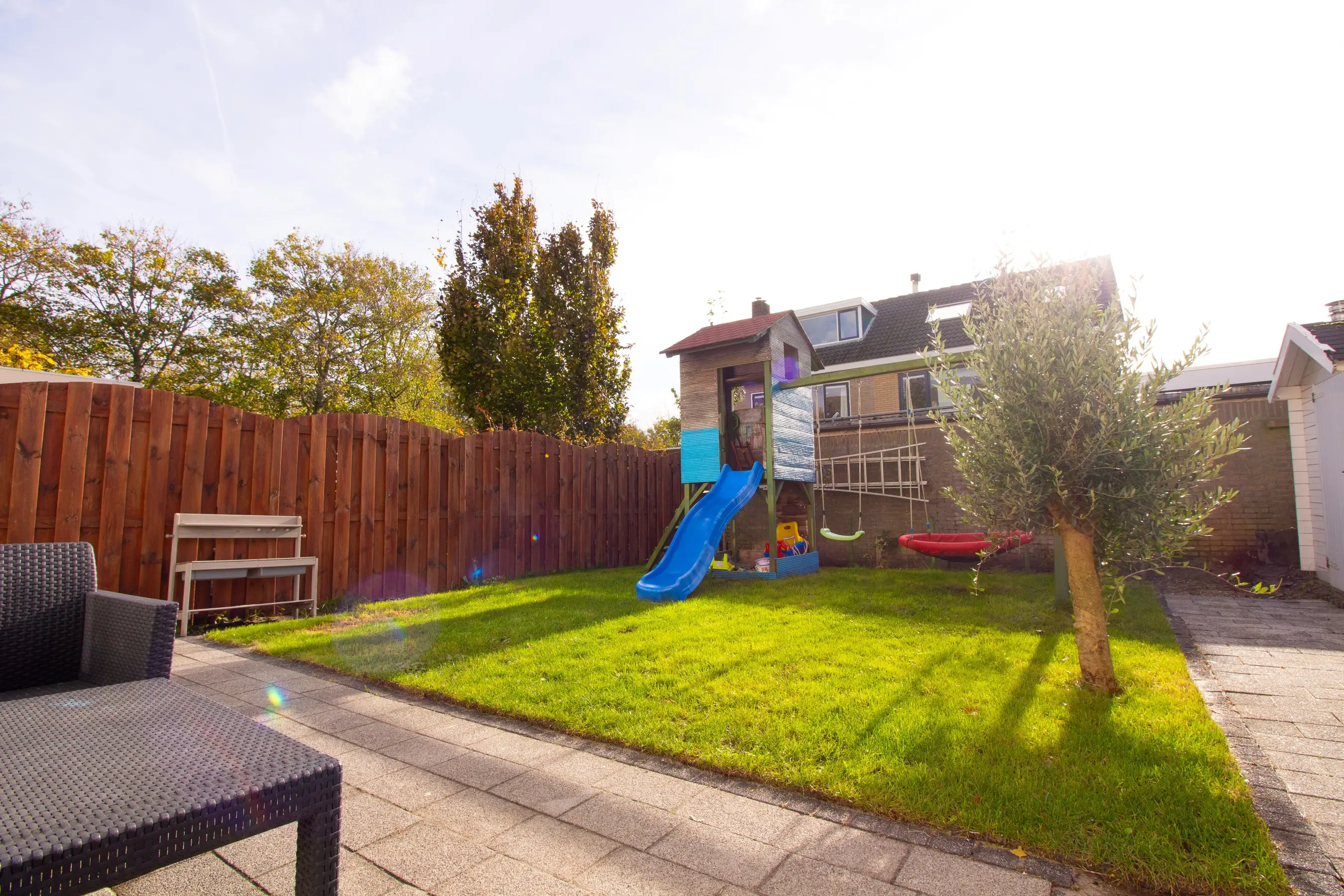 Tuin: de zuidelijke ligging van de tuin garandeert u de gehele dag de zon! Een heerlijke tuin met sierbestrating en een grasveld waar kids heerlijk op kunnen spelen. Achter in de tuin is een extra chaletberging aanwezig.