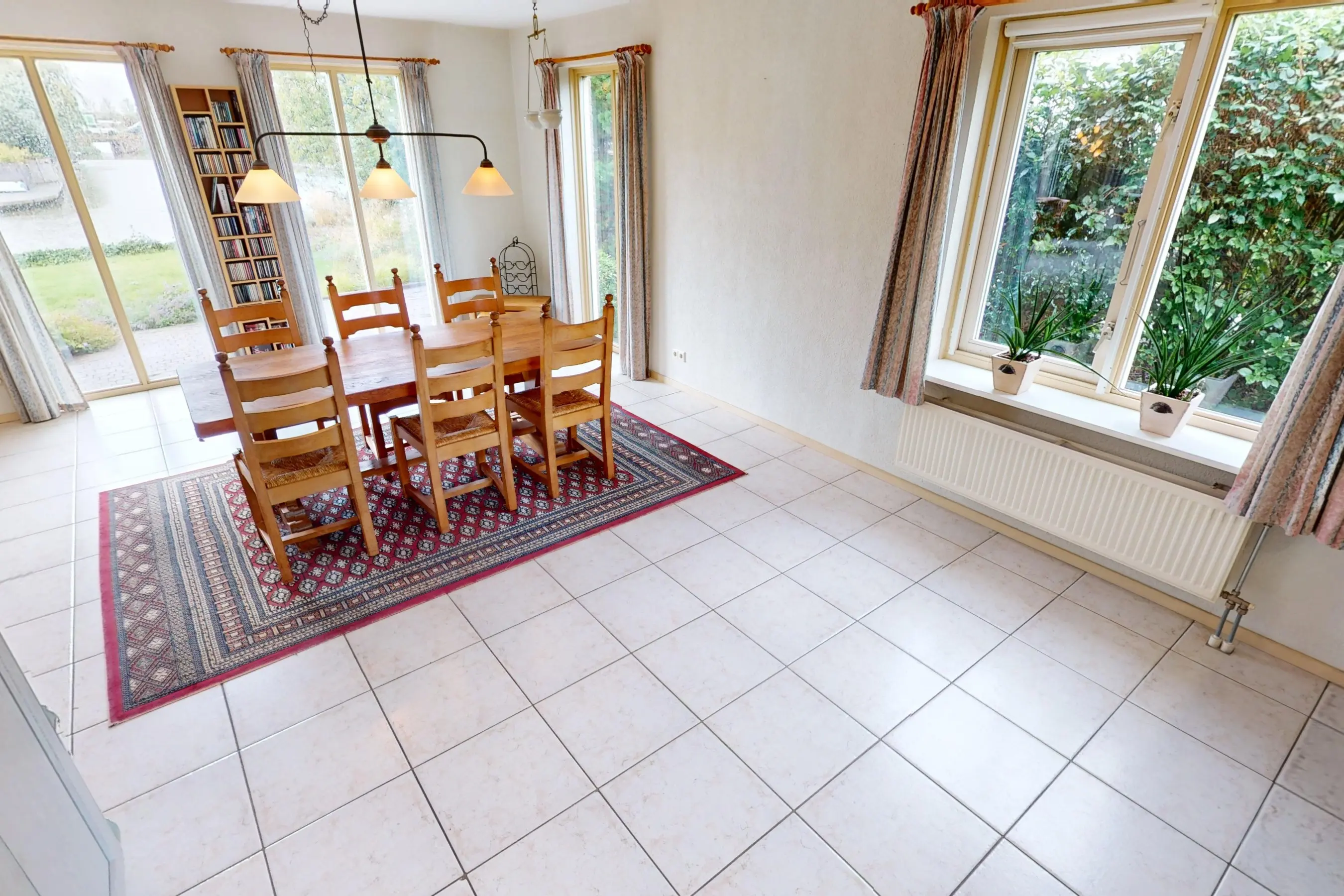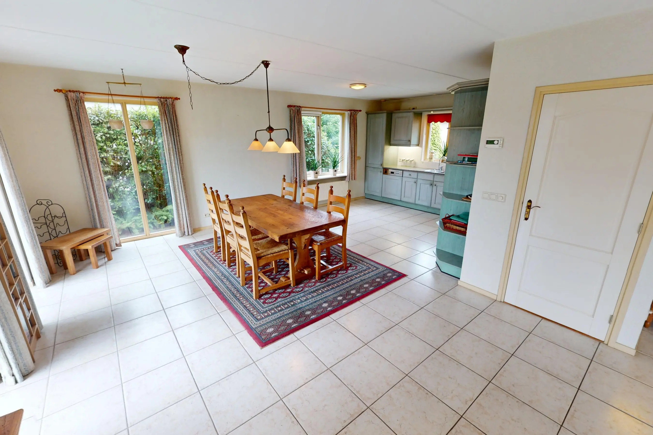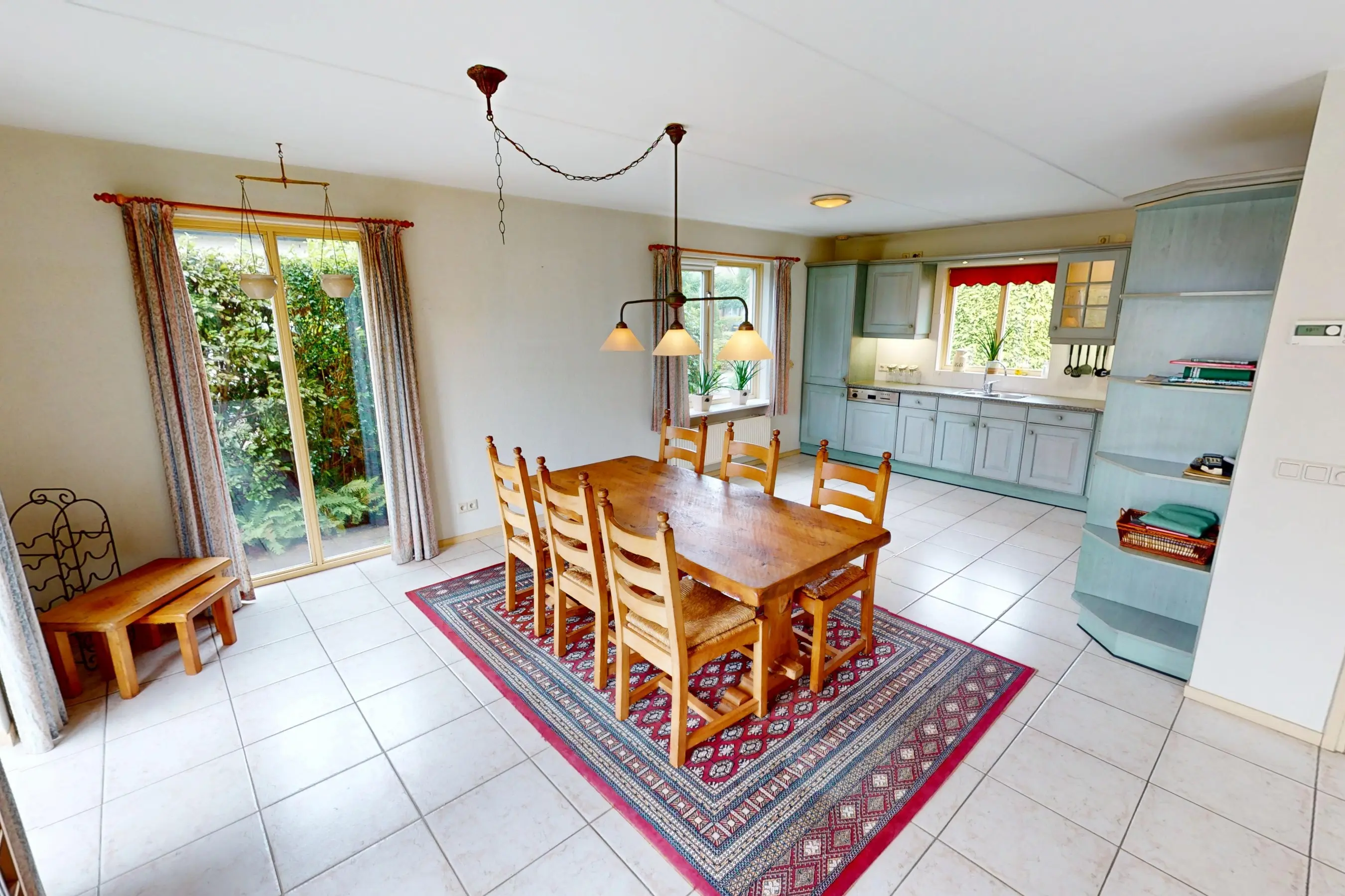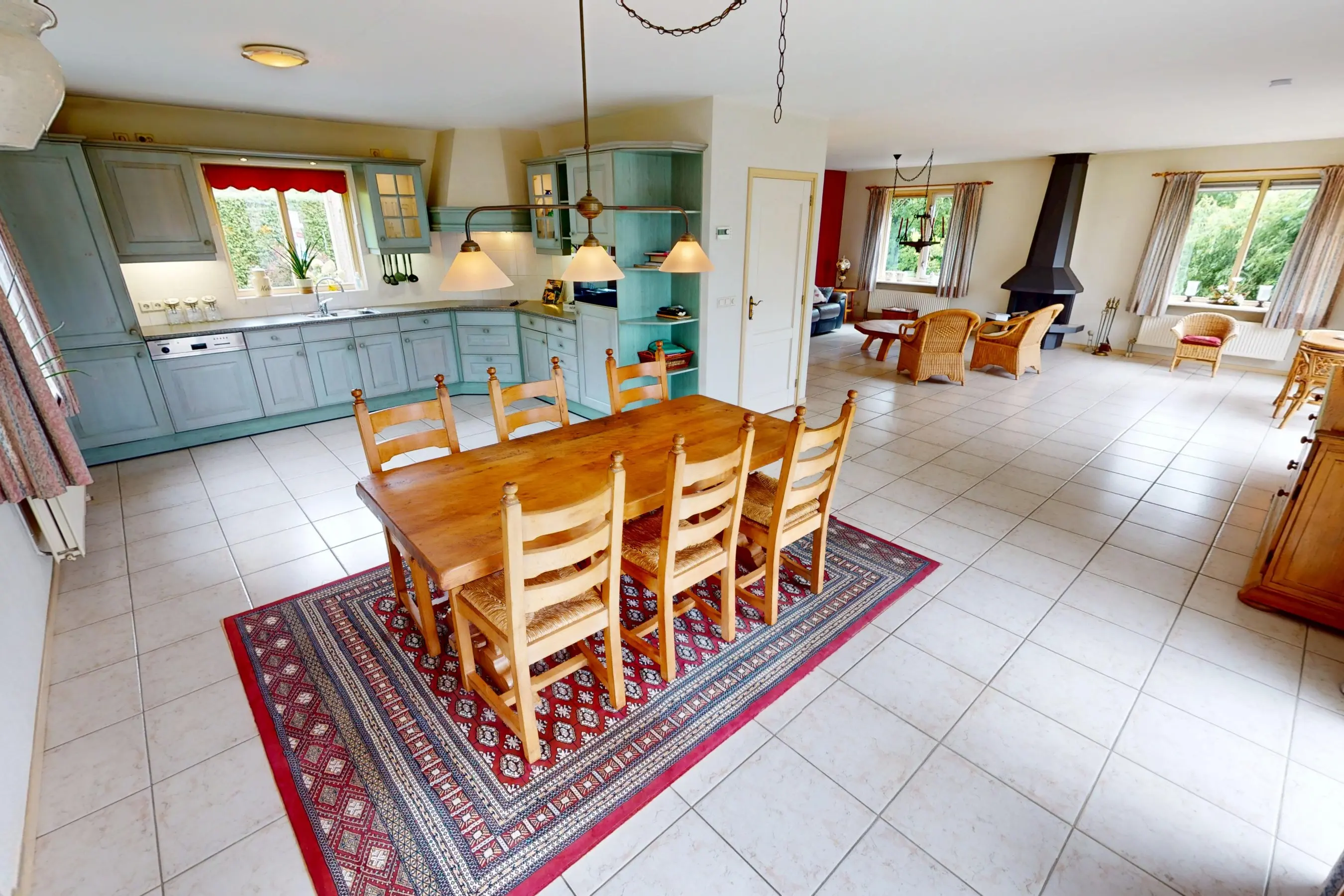 De woon/leefkeuken bevindt zich aan de achterzijde van de woning en betreft een massief eiken keuken. De keuken is in L-vorm uitgevoerd, waardoor u veel werkruimte tot uw beschikking heeft. De keuken is verder voorzien van een afzuigkap, keramische kookplaat, combimagnetron en koel/vriescombinatie. U heeft eveneens de mogelijkheid voor het plaatsen van een vaatwasser. In deze ruimte kunt prima een grote eetkamertafel kwijt, waardoor u fijn met het gezin of vrienden kunt natafelen of ’s avonds fijn samen een spelletje doen.