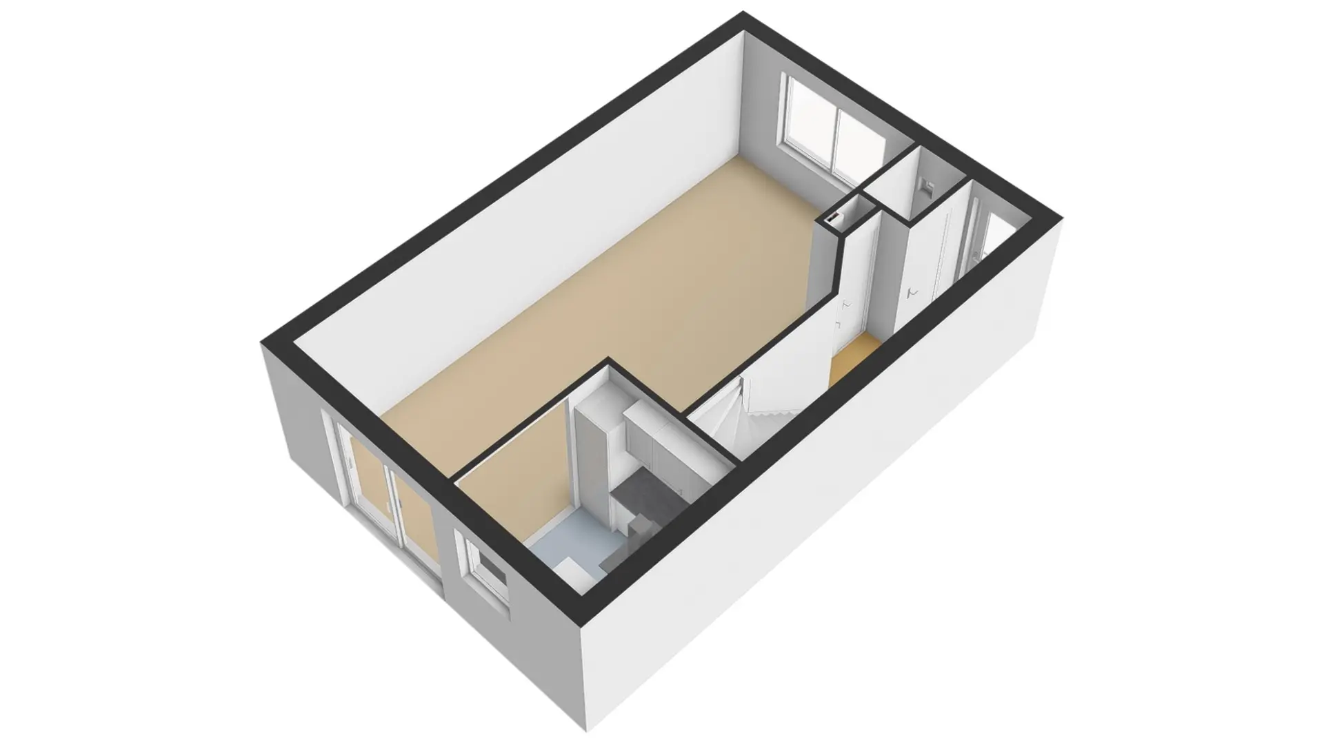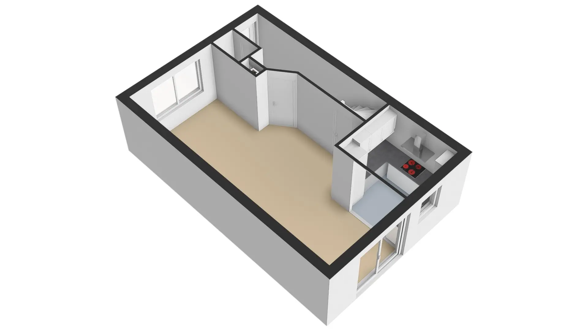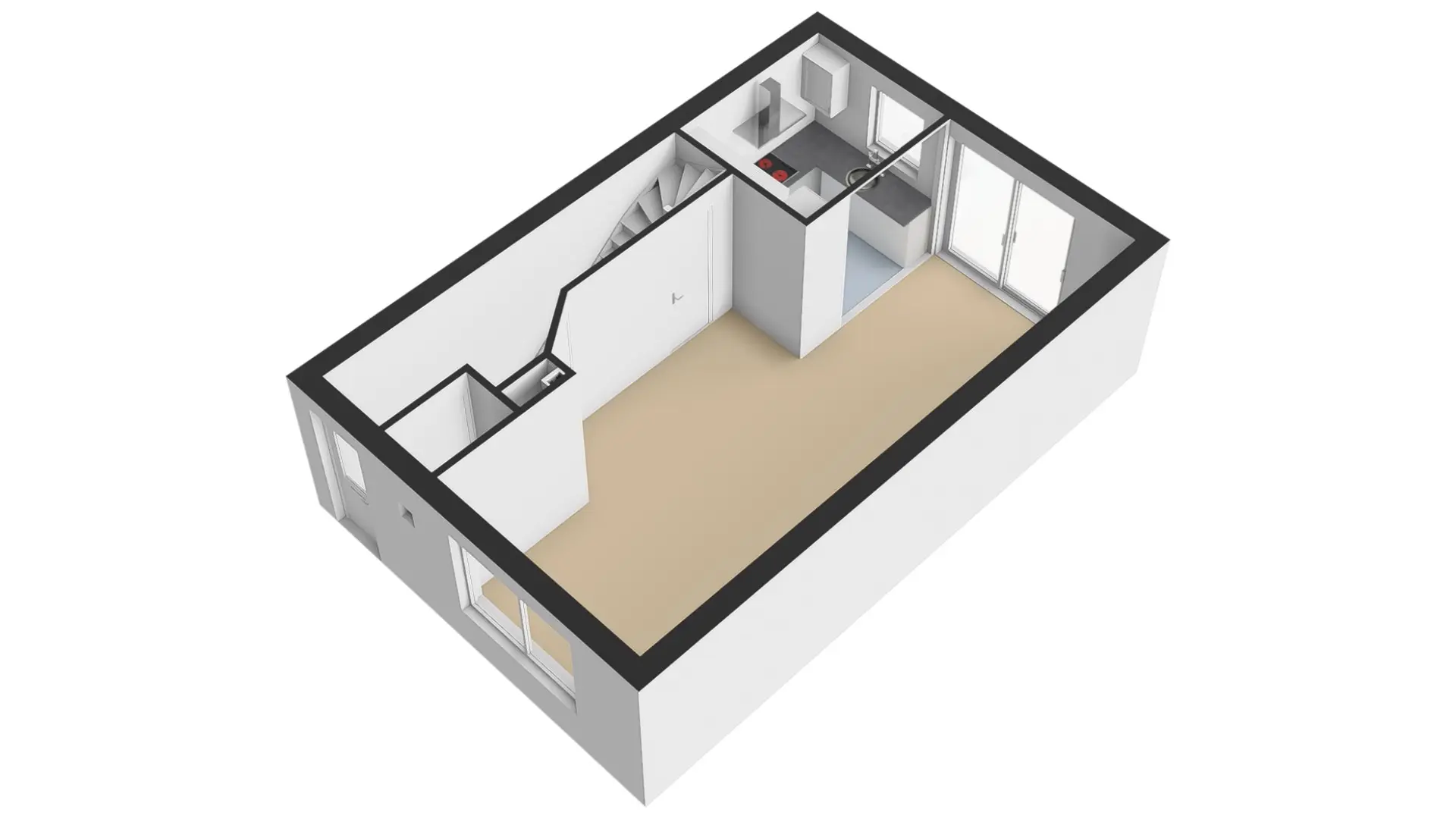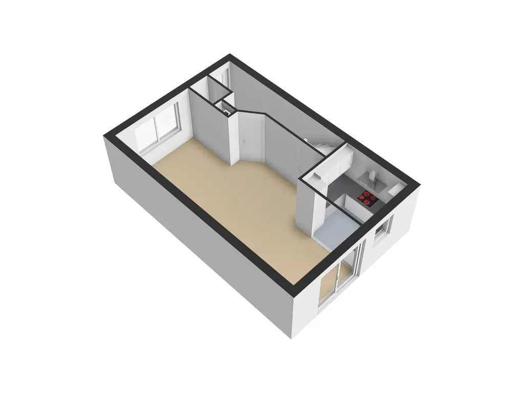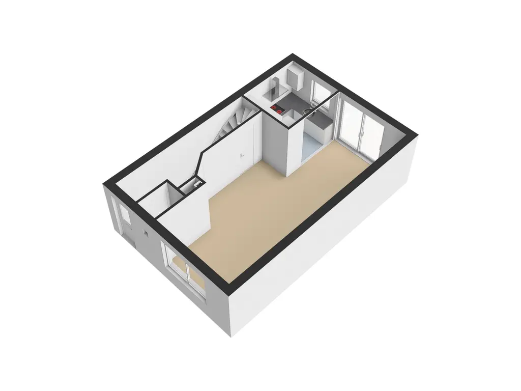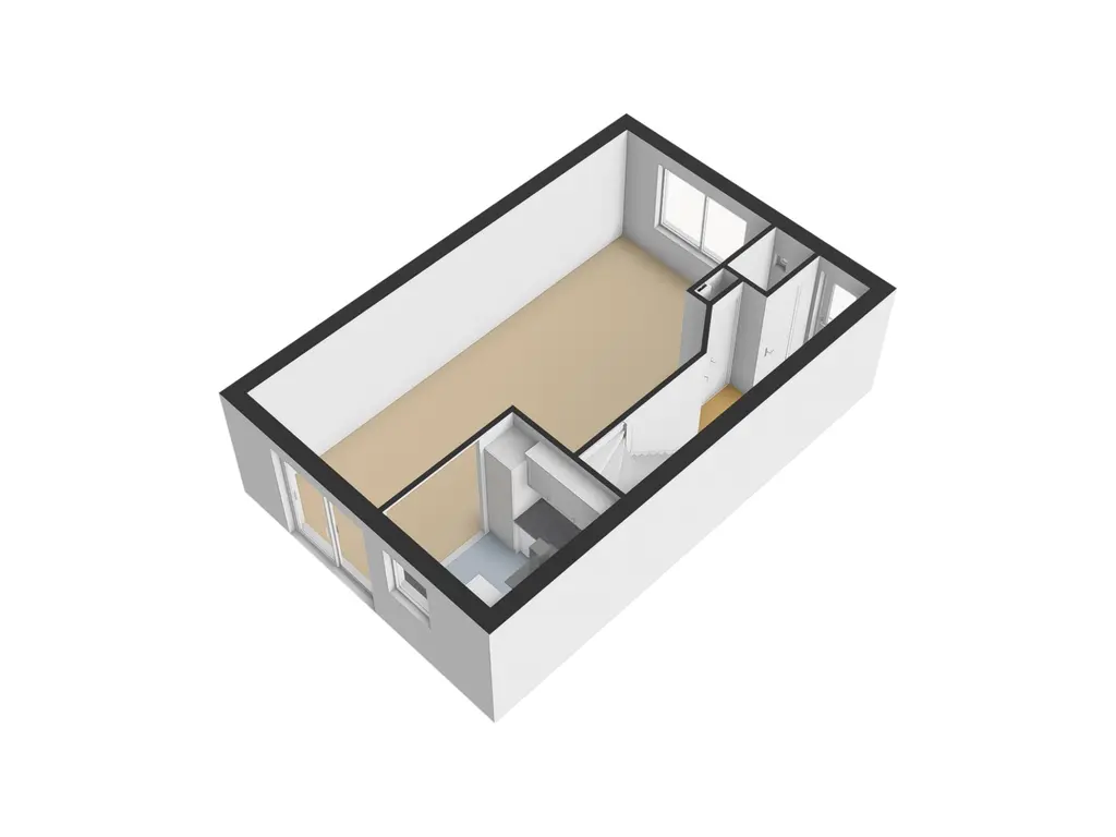Vanuit de hal kunt u de L-vormige woonkamer bereiken. Door de grote raampartij aan de voorzijde van de woning heeft u veel lichtinval in de woning. U heeft hier de mogelijkheid om een lekkere loungebank te plaatsen. Vanuit de bank heeft u dan fijn zicht op de straat aan de voorzijde. Halverwege de woonkamer is een vaste kast aanwezig. Ideaal om als een extra opbergruimte te gebruiken. Aan de achterzijde van de woning treft u naast de open keuken, ook een schuifpui aan wat een fijne overgang naar de tuin verzorgd.