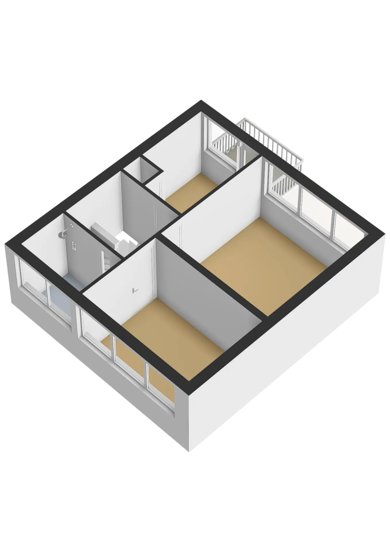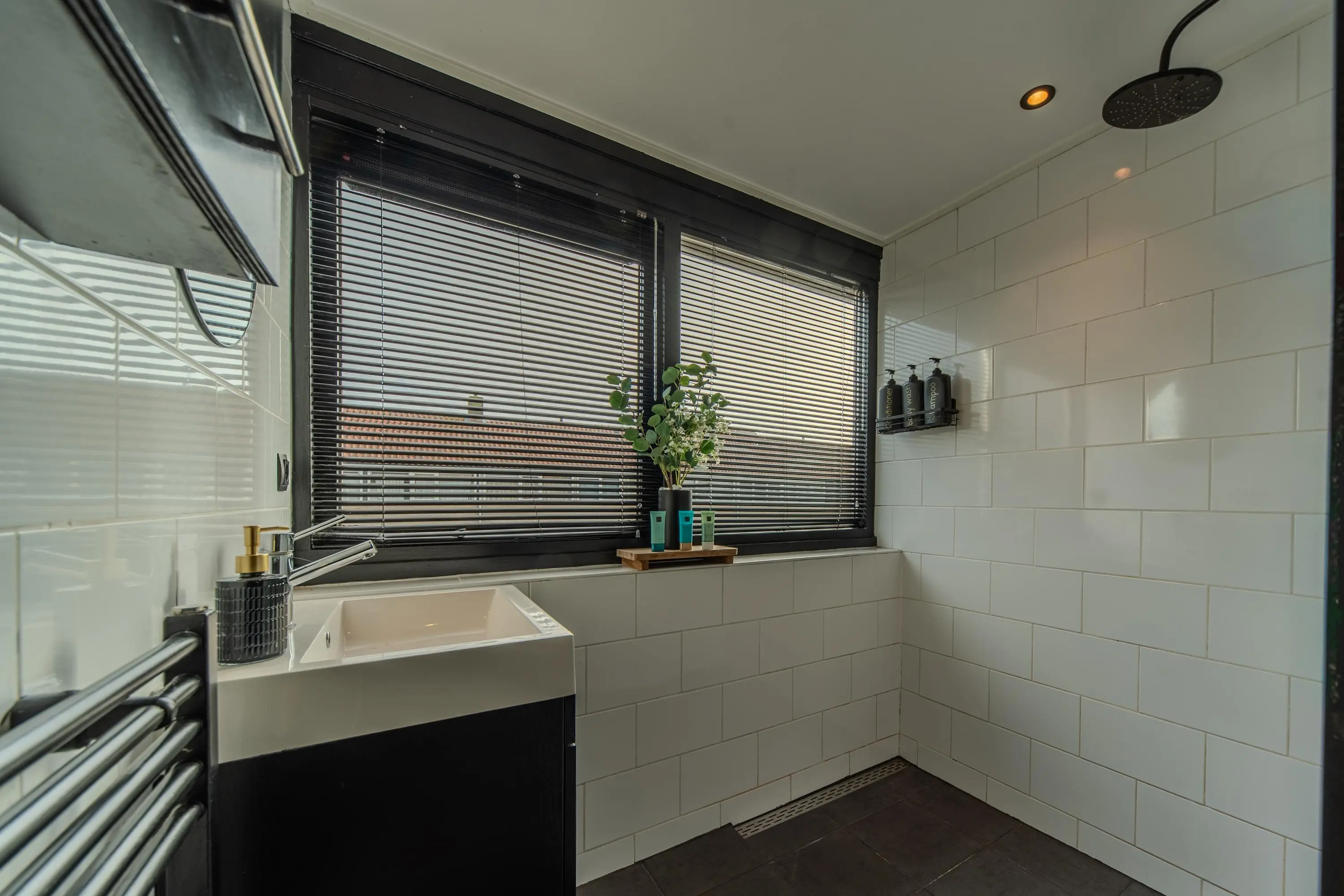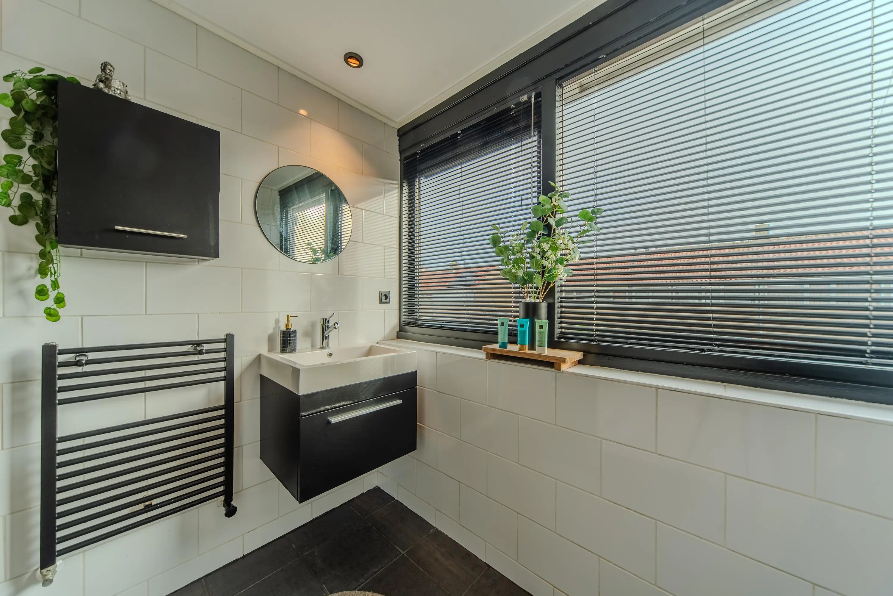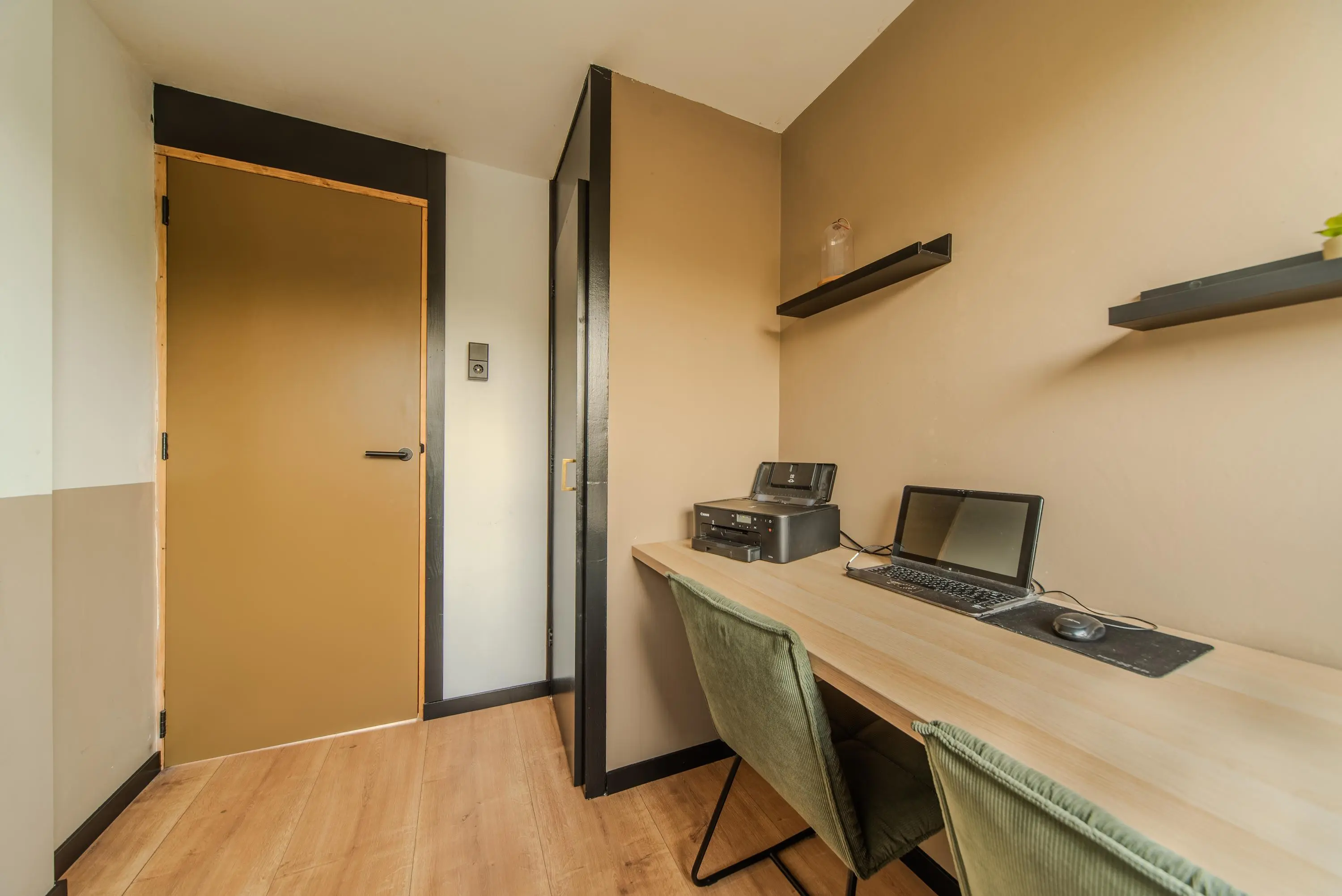 Op de eerste verdieping bevinden zich twee slaapkamers van verschillend formaat, de functionele badkamer met douche en vrijhangend badkamermeubel en tevens een compacte extra kamer. Deze kamer wordt momenteel gebruikt als kantoorruimte en beschikt over een balkon, gesitueerd op het westen. Dankzij deze ligging kunt u hier heerlijk genieten van de middag- en avondzon. De kantoorruimte kan desgewenst nog worden omgebouwd tot een kinderkamer.