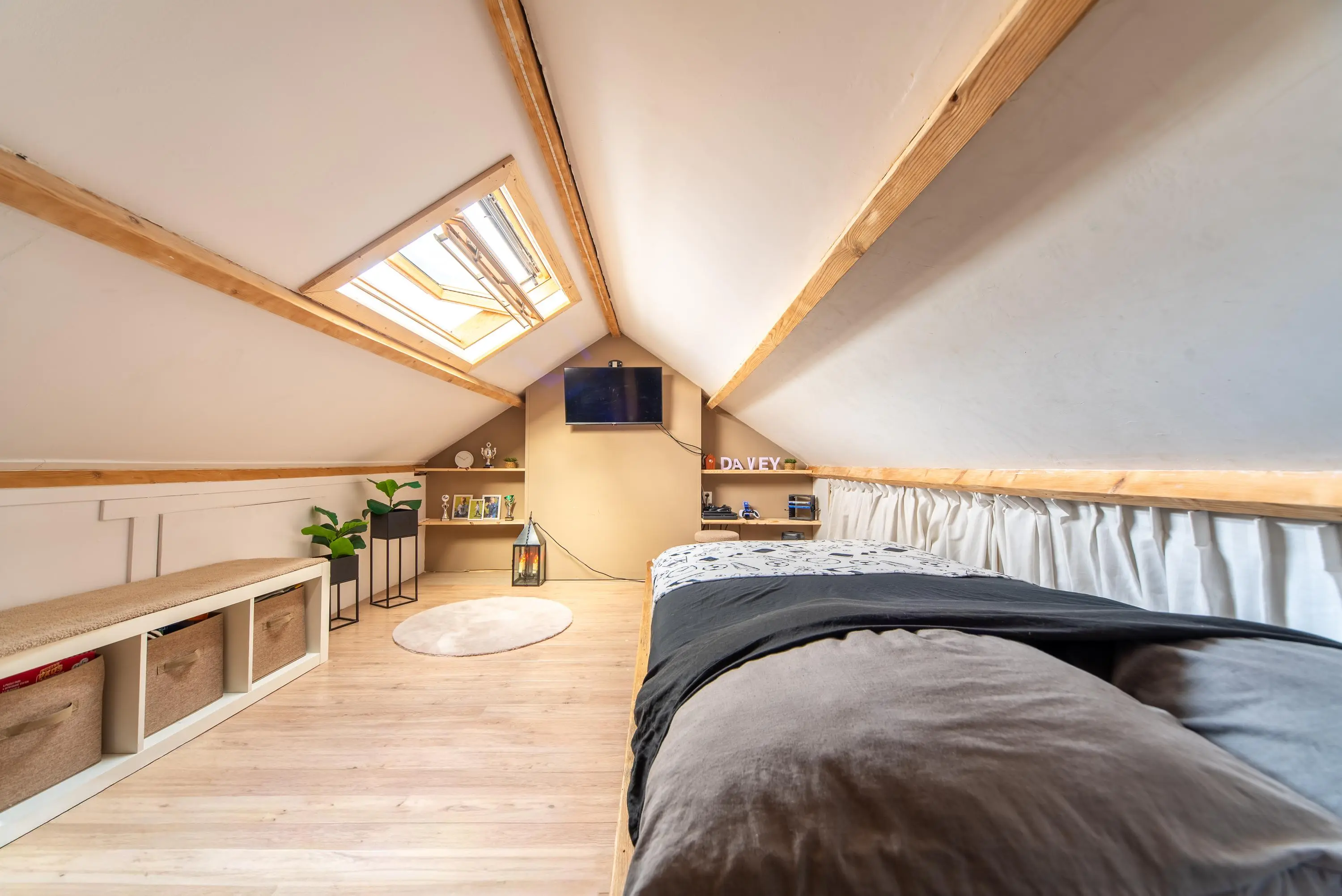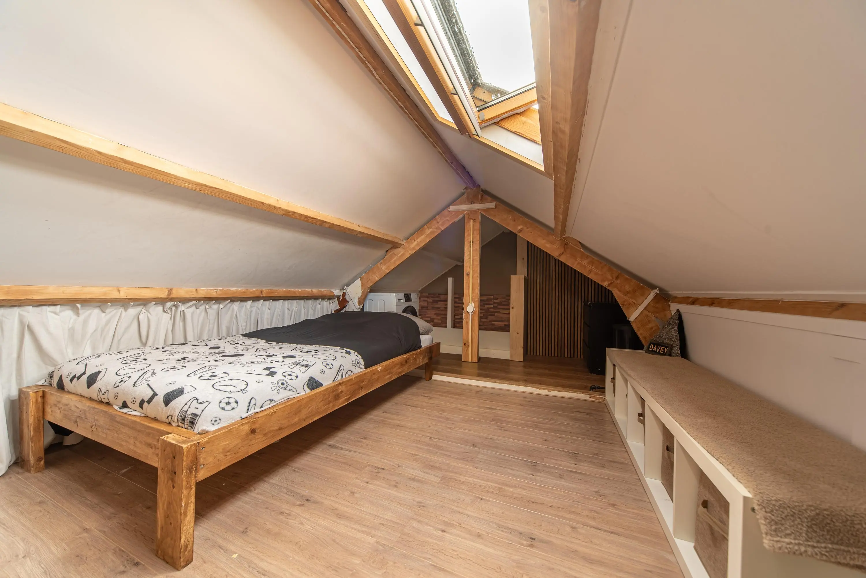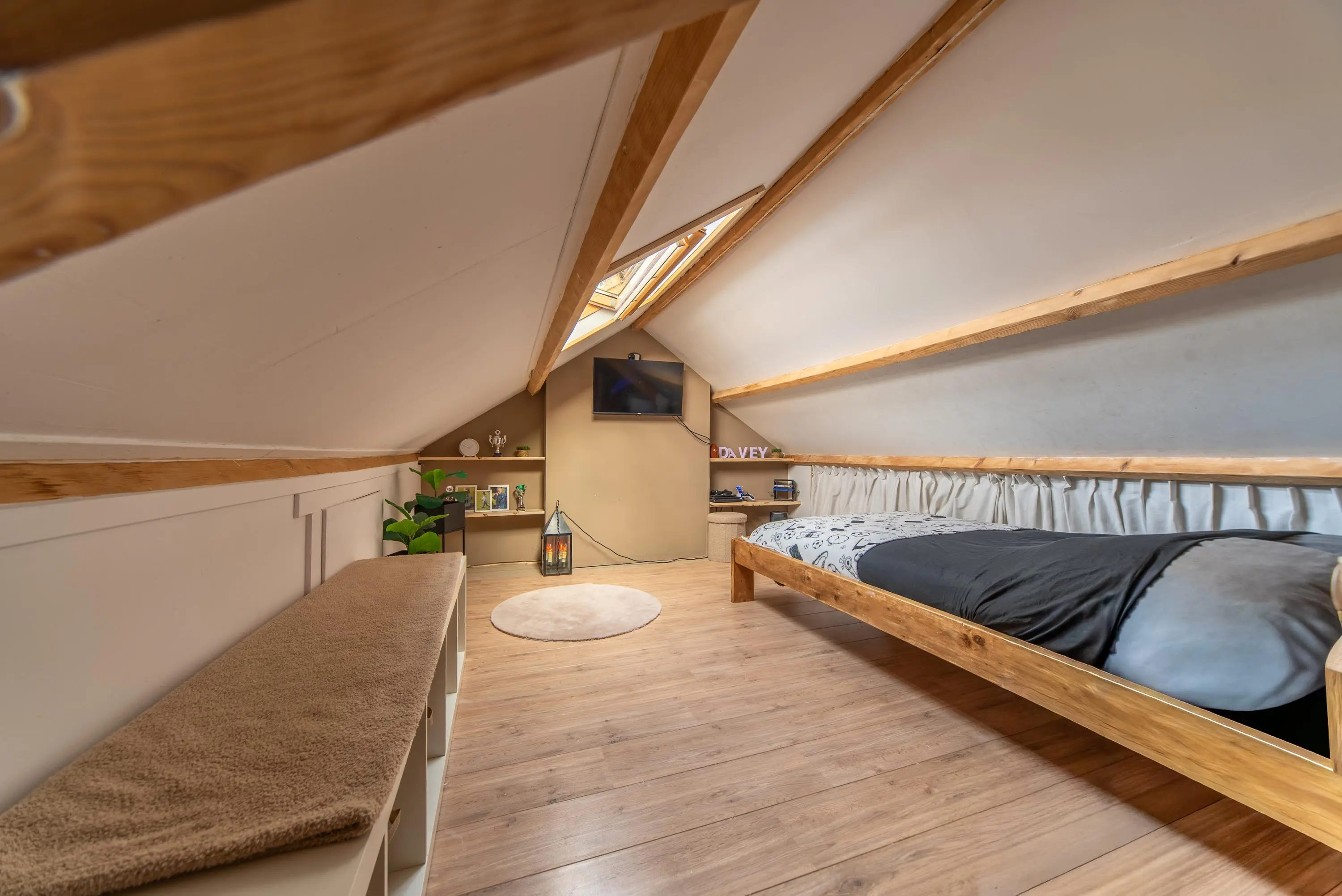 De tweede verdieping is bereikbaar via een vaste trap en biedt een ruime zolderkamer op de vliering met Velux dakraam. Deze is reeds in gebruik als slaapkamer voor één van de kinderen. Houd u er rekening mee dat de nokhoogte op het hoogste punt circa 185 cm bedraagt. Hier bevindt zich achter een voorzetwand ook de Intergas Kombi Kompakt HRE 36/30 CV-combiketel uit 2012. Deze heeft altijd regelmatig onderhoud gehad en gaat naar alle waarschijnlijkheid dus nog jaren mee.